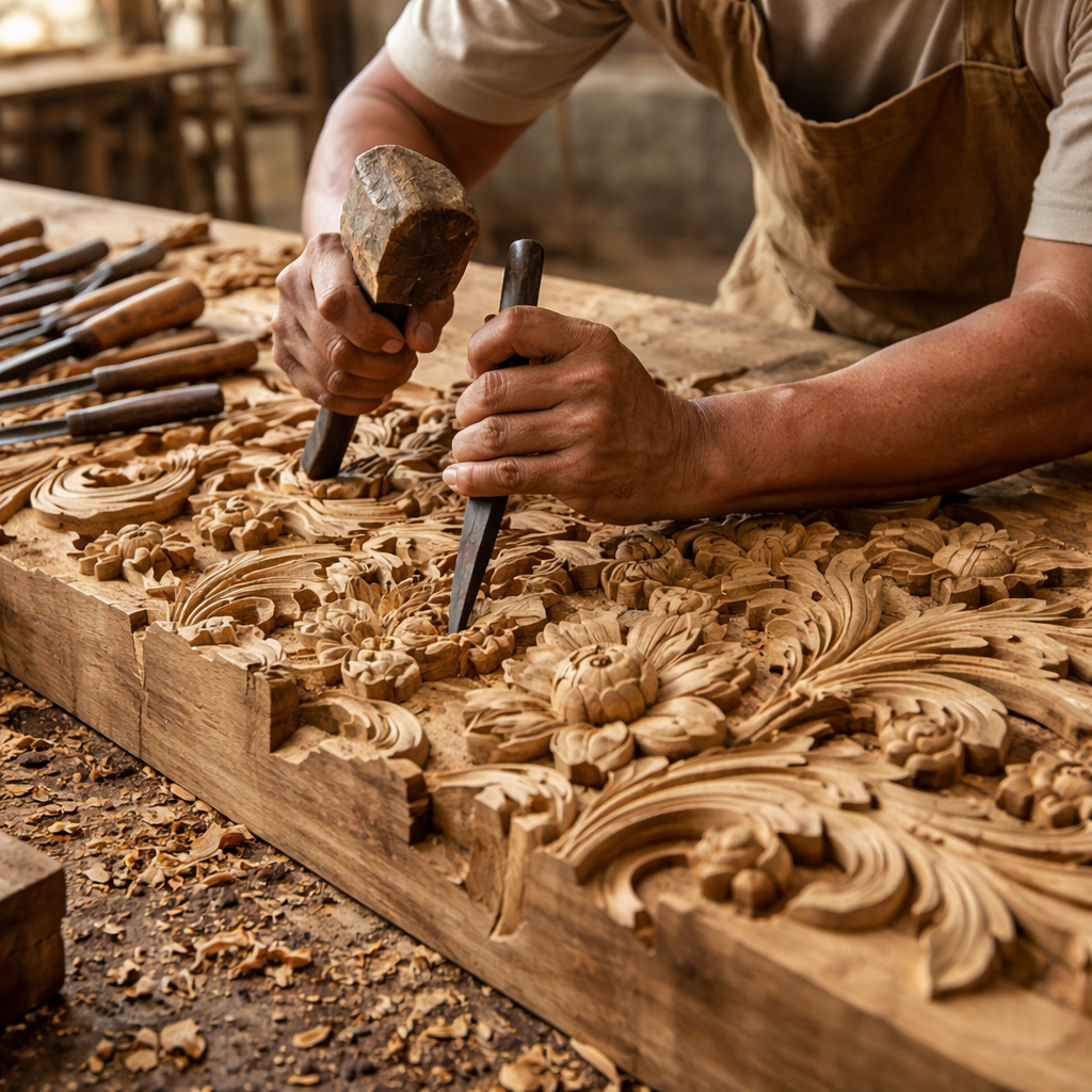 Craftsmen hand-carving teak wood